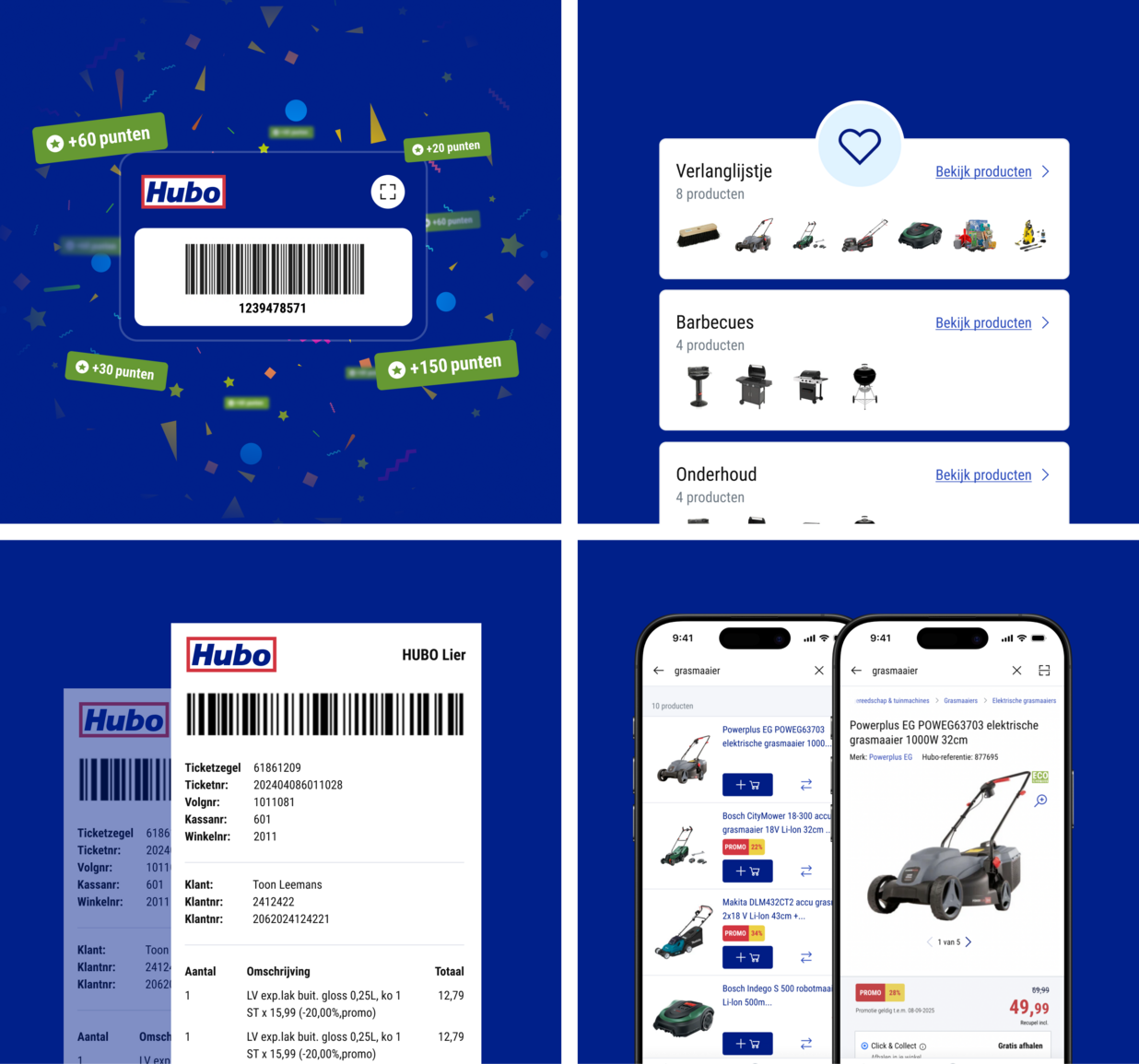 De opdracht was veelzijdig: ontwerp een intuïtieve mobiele ervaring die naadloos aansluit op bestaande systemen zoals productzoeken en acties, digitaliseer de fysieke Bonuskaart, en doe dit alles zonder afbreuk te doen aan de vertrouwde Hubo-uitstraling die klanten kennen en waarderen.